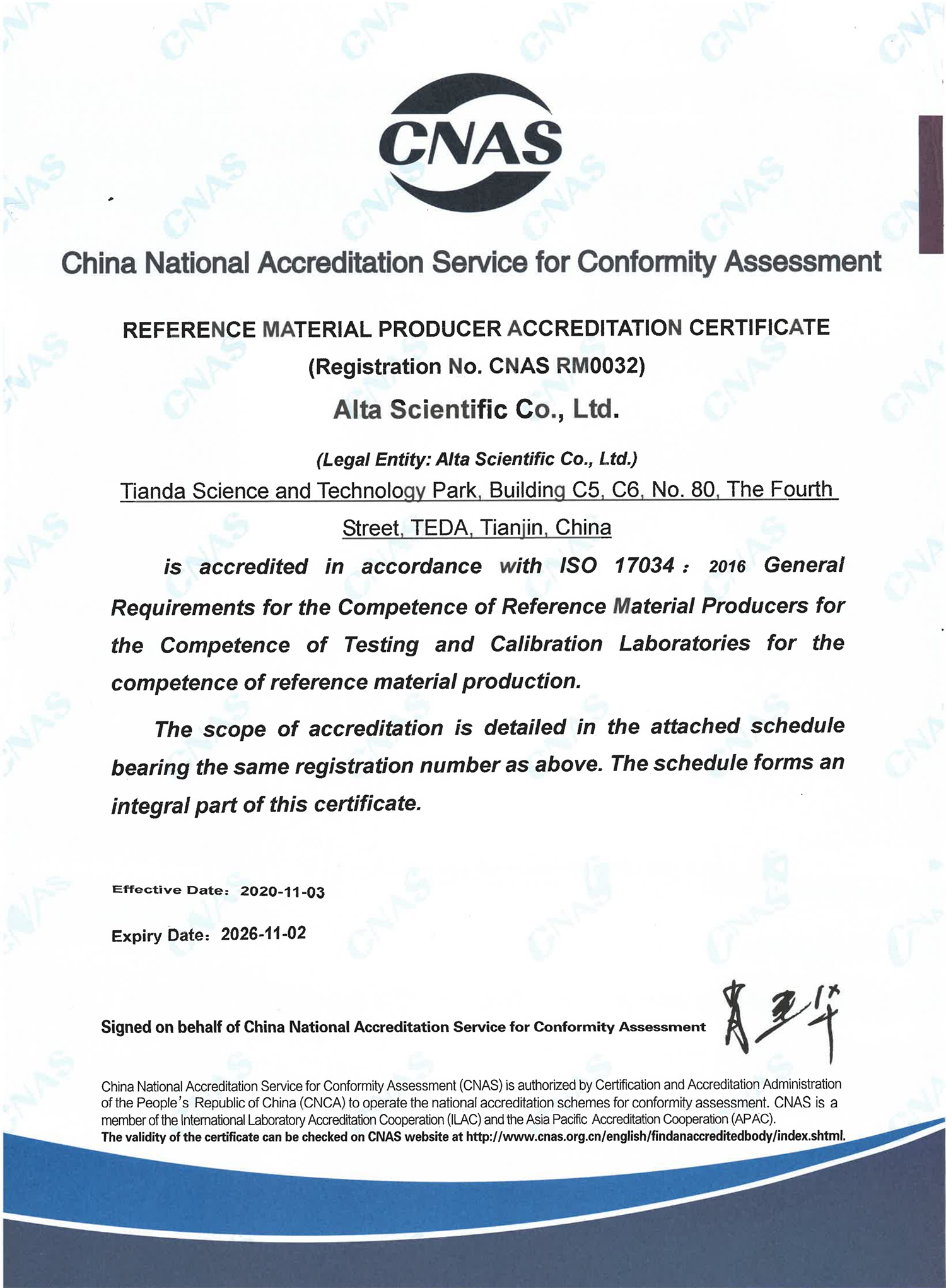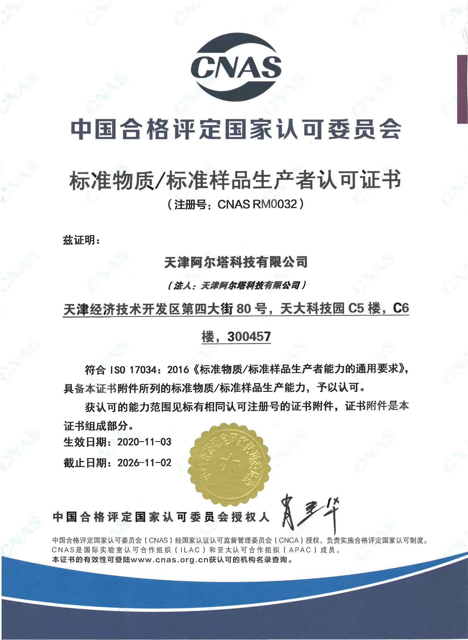 中国合格评定国家认可委员会,标淮物质/标准样品生产者认可证书